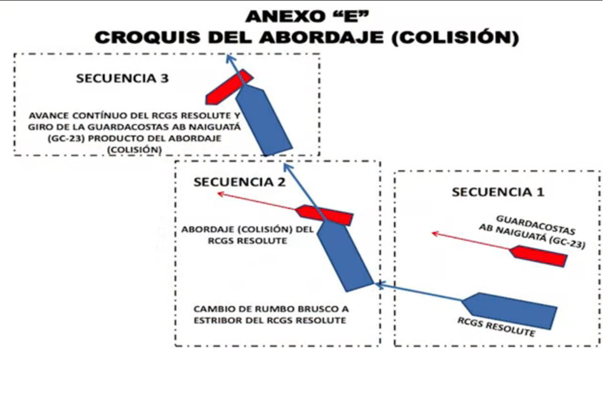 Схема тарана венесуэльского сторожевого корабля: На видео то-же самое. Вначале корабли шли на параллельном курсе (сторожевой корабль красный), затем португальский транспорт повернул вправо и протаранил сторожевой корабль разодрав ему бульбом левый борт ниже ватерлинии. Как я понял командир венесуэльского сторожевого корабля даже не предполагал такого.