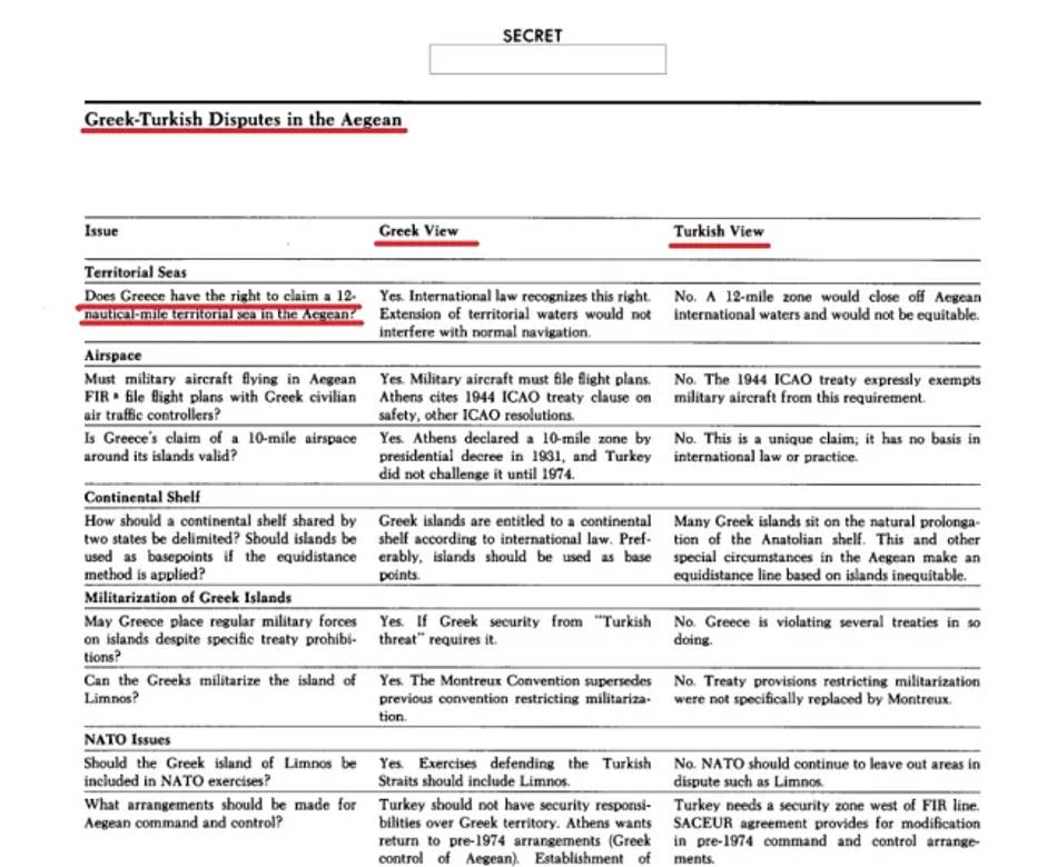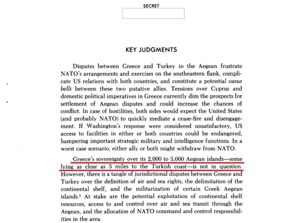 Для ЦРУ с того периода было ясно, что «споры о территориальных водах и милитаризации островов являются наиболее трудноразрешимыми, поскольку они затрагивают контроль над экономическими коридорами и береговую оборону… На карту поставлена потенциальная эксплуатация ресурсов континентального шельфа, доступ и контроль воздушного и морского транзита через Эгейское море и распределение ответственности НАТО по командованию и управлению в регионе» .
