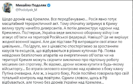 Напомним, ранее он заявлял, что удар по Кремлю организовали российские антипутинские «партизаны». https://t.me/s/stranaua
